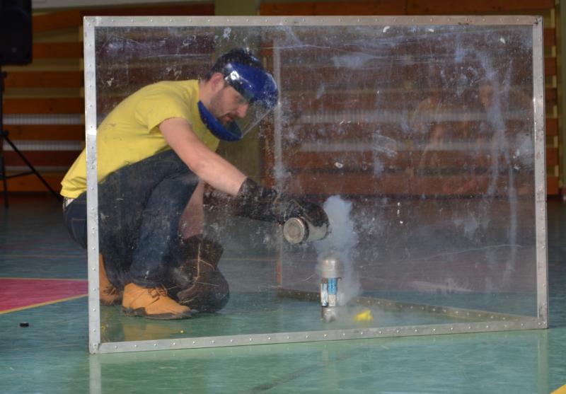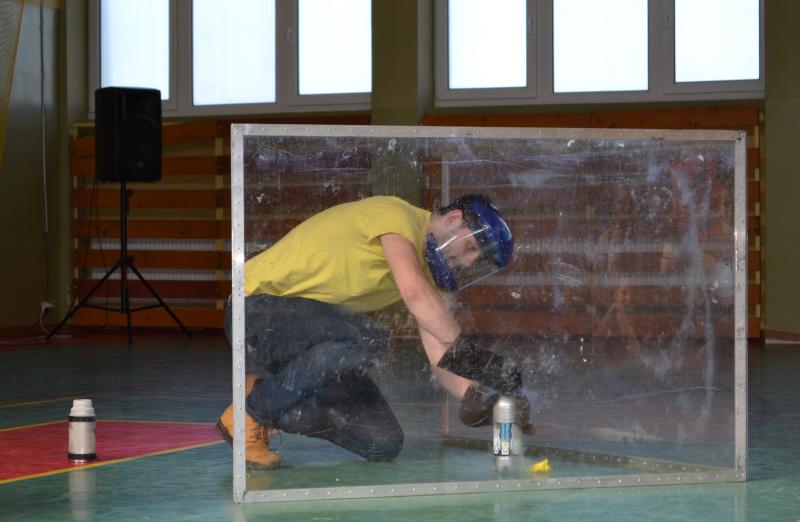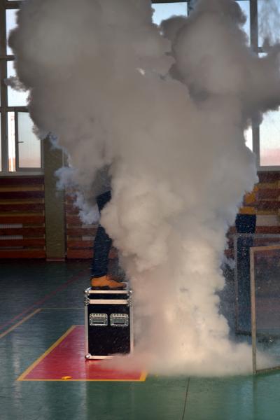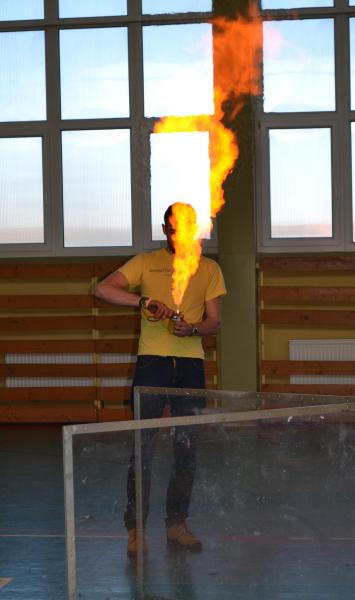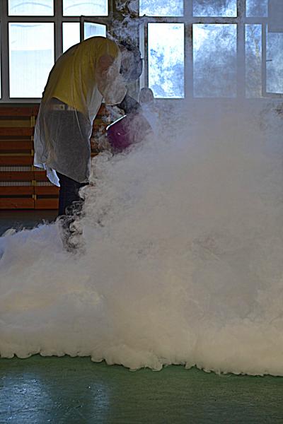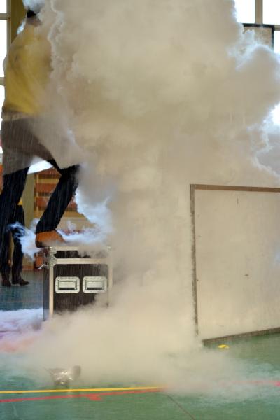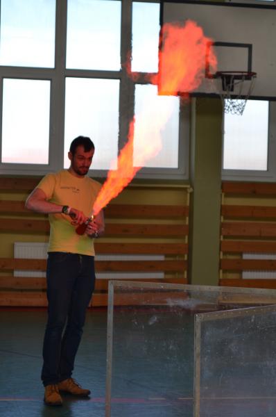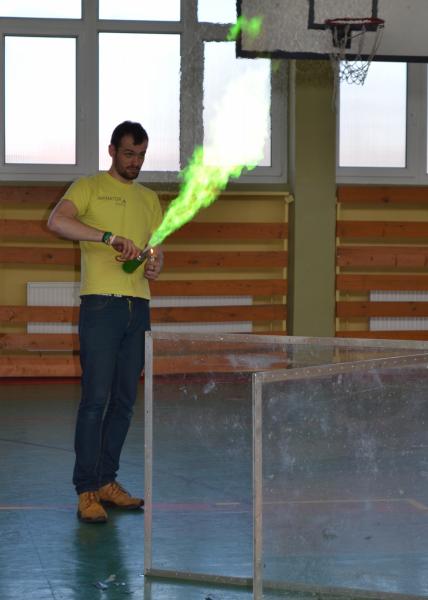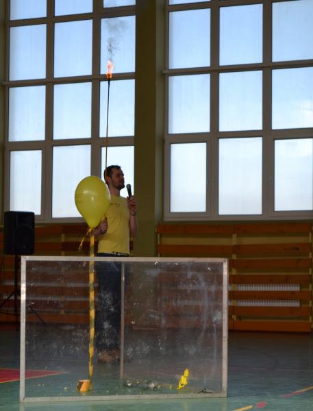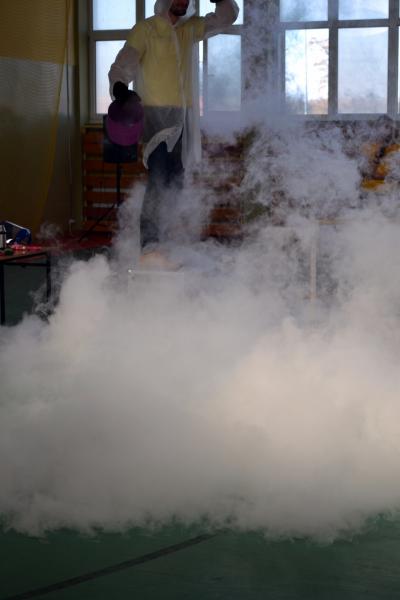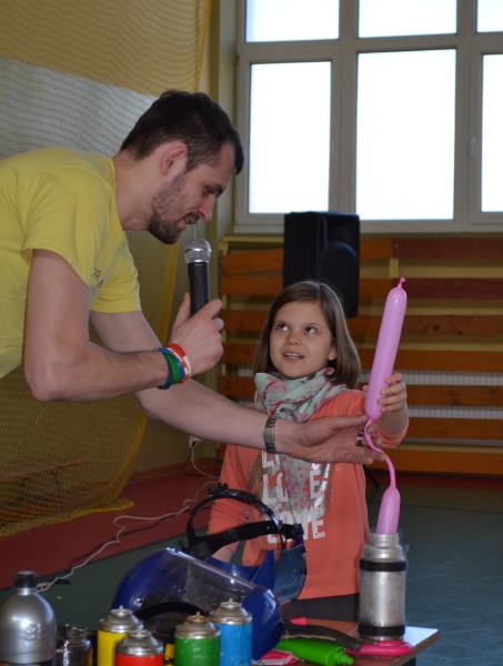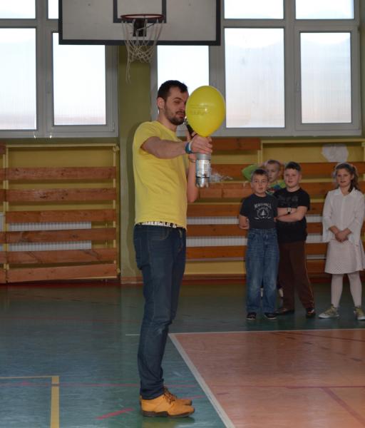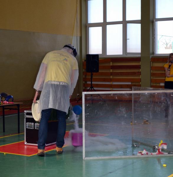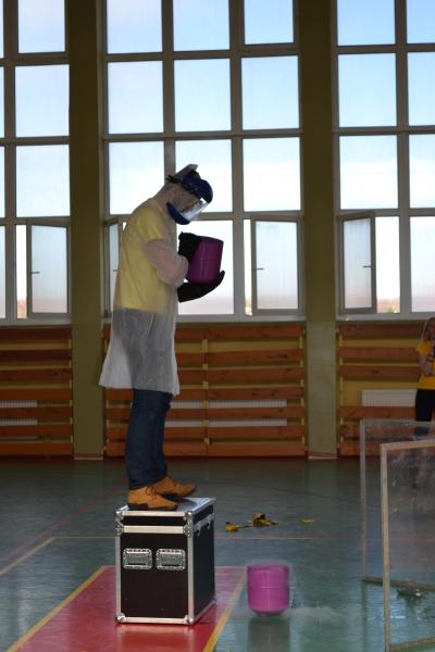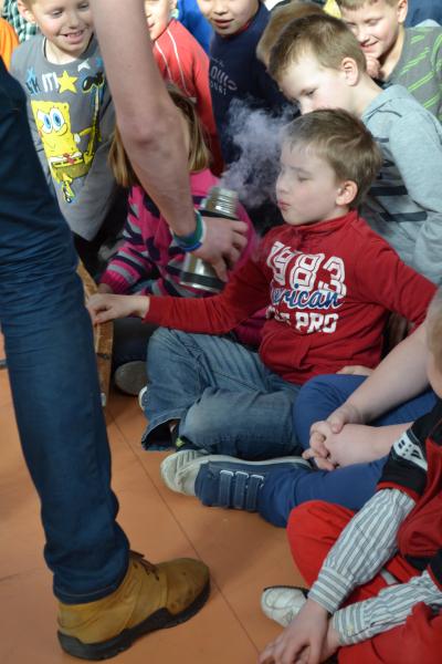 Na sali gimnastycznej dzieci doświadczały m.in. wybuchów wodno – azotowych, kolorowych ogni. W czasie pokazów wybuchało, padało, świeciło. Było głośno, radośnie i naukowo.