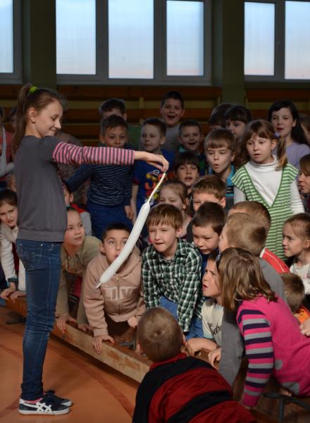 Zadaniem szkoły było przygotowanie prezentacji pt. ”Dlaczego warto uczyć się przez zabawę”. Uczniowie klasy IIa pod opieką Eleny Madej opisali doświadczenia, które wykonali z opiekunem, by wyjaśnić skąd się bierze tęcza, jak załamują się promienie słoneczne. Praca był tak dobra, że wygraliśmy dwa pokazy naukowe dla uczniów szkoły podstawowej – dla klas I- III i IV- VI o wartości 1000,00 zł. każdy.