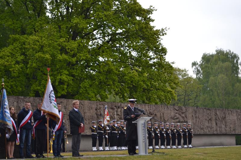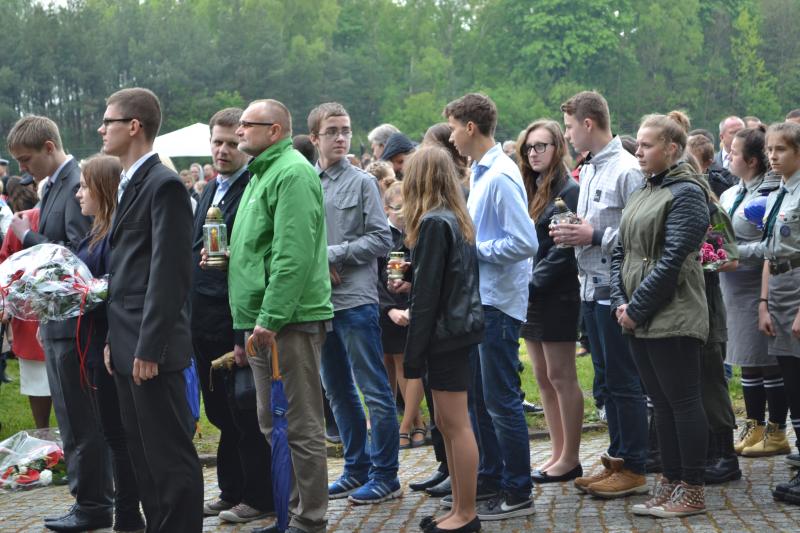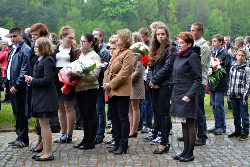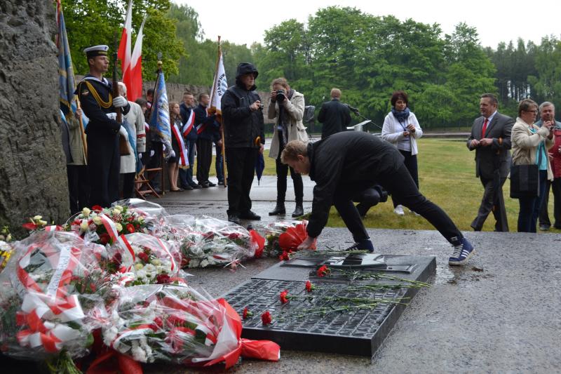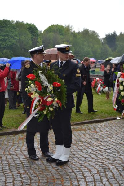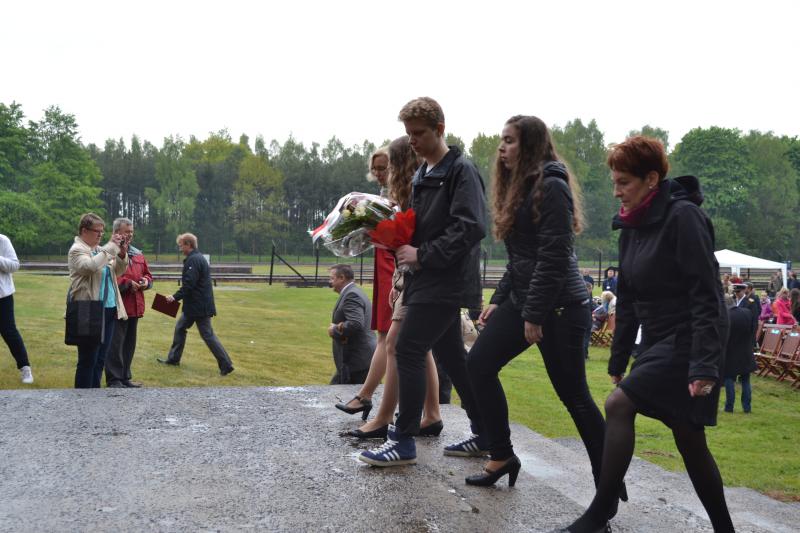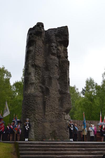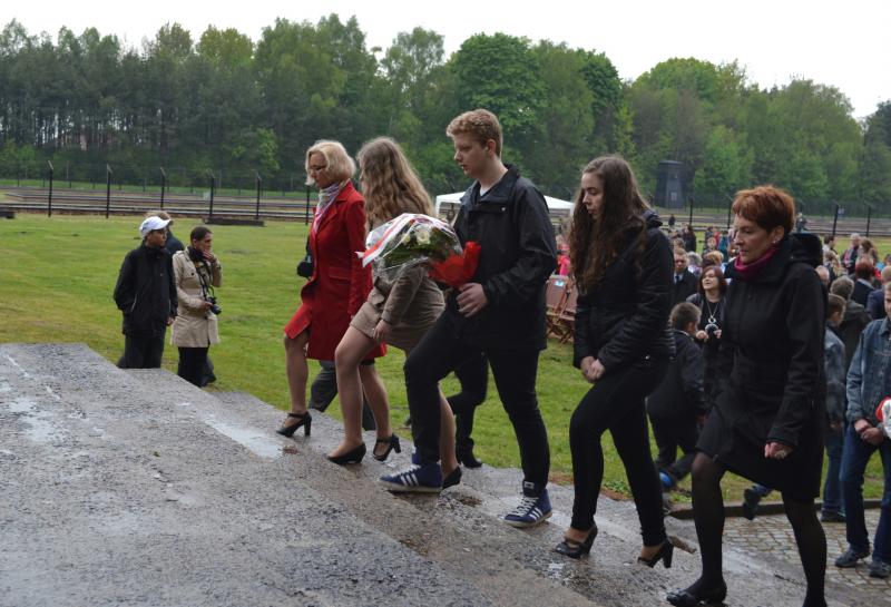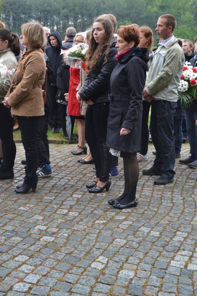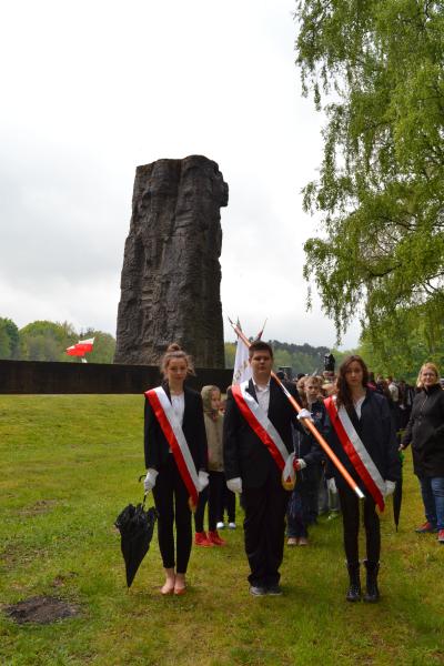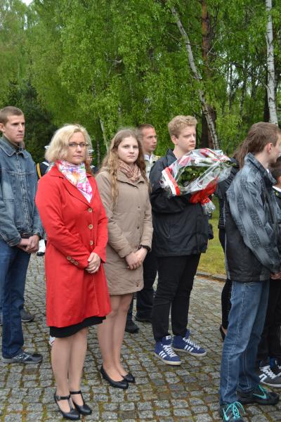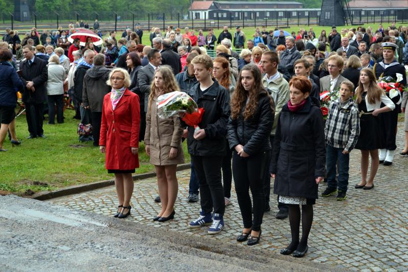 Po spotkaniach z byłymi więźniami wszyscy uczniowie klas IV – VI szkoły podstawowej i I – III gimnazjum udali się do Muzeum Stutthof, gdzie wzięli udział w uroczystości patriotycznej związanej z 69. rocznicą wyzwolenia obozu. Mimo deszczu służbę dzielnie pełnił poczet sztandarowy szkoły. Delegacja reprezentująca społeczność szkolną złożyła wiązankę kwiatów pod pomnikiem, a wszyscy uczniowie i nauczyciele z uwagą wysłuchali przesłania byłych więźniów.