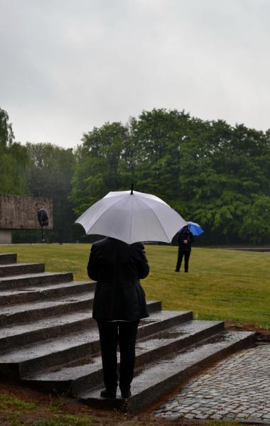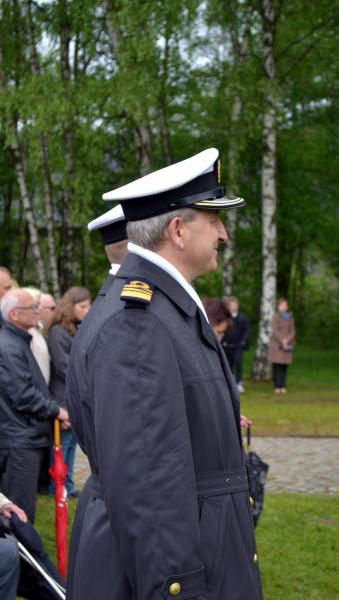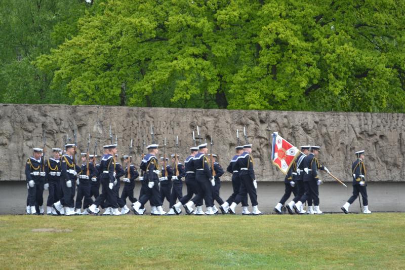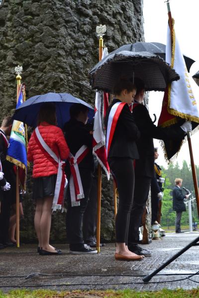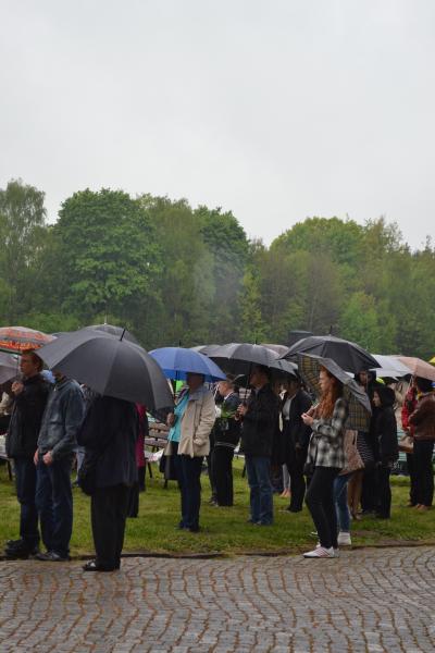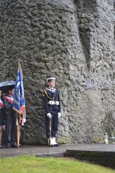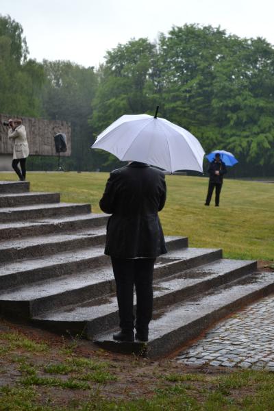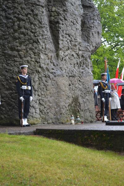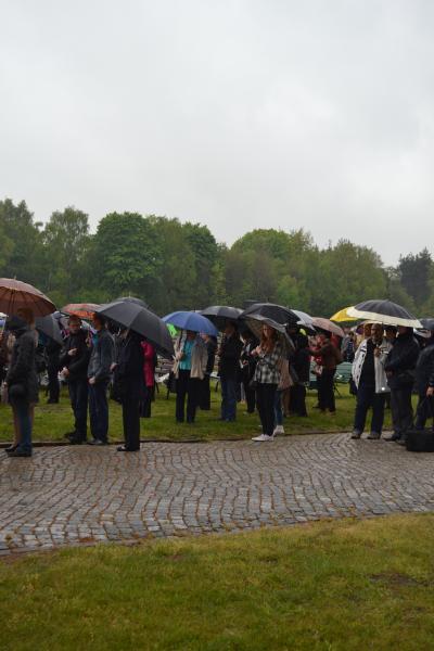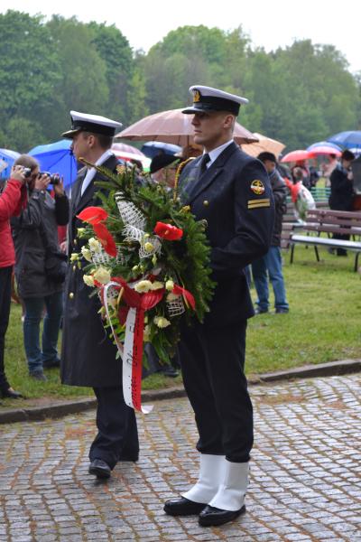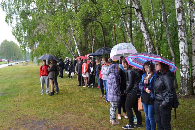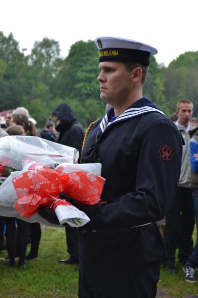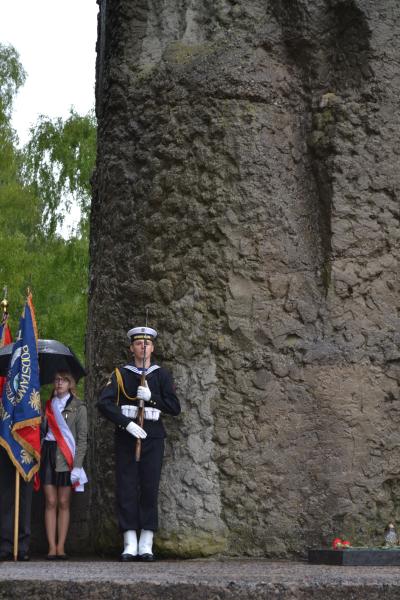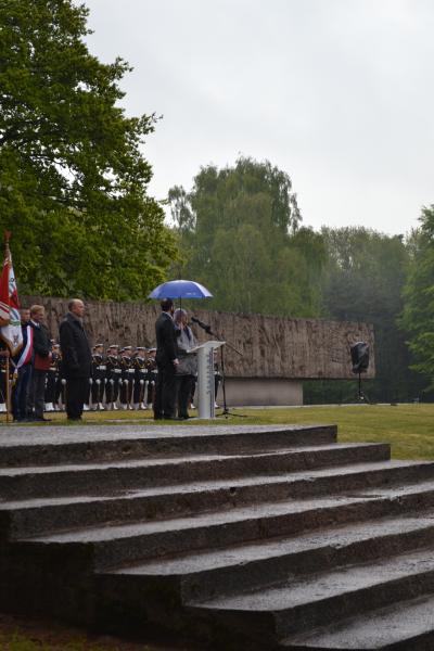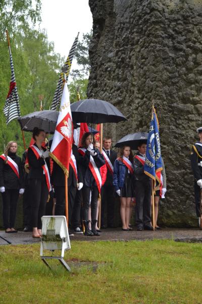 Po spotkaniach z byłymi więźniami wszyscy uczniowie klas IV – VI szkoły podstawowej i I – III gimnazjum udali się do Muzeum Stutthof, gdzie wzięli udział w uroczystości patriotycznej związanej z 69. rocznicą wyzwolenia obozu. Mimo deszczu służbę dzielnie pełnił poczet sztandarowy szkoły. Delegacja reprezentująca społeczność szkolną złożyła wiązankę kwiatów pod pomnikiem, a wszyscy uczniowie i nauczyciele z uwagą wysłuchali przesłania byłych więźniów.