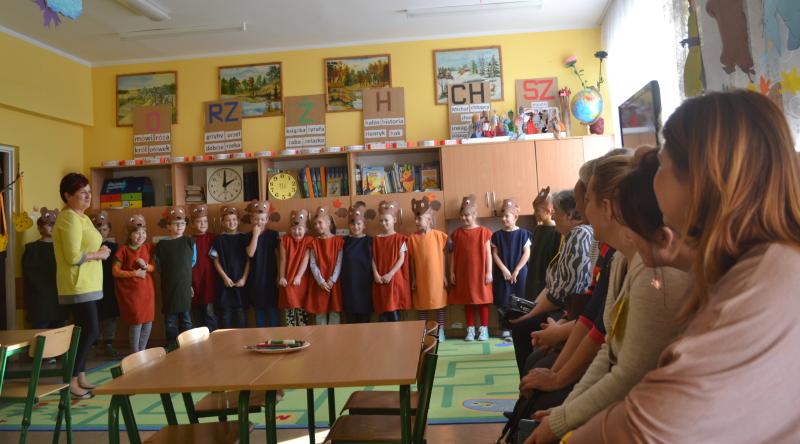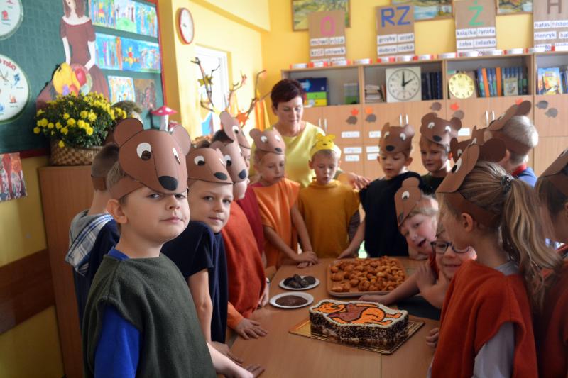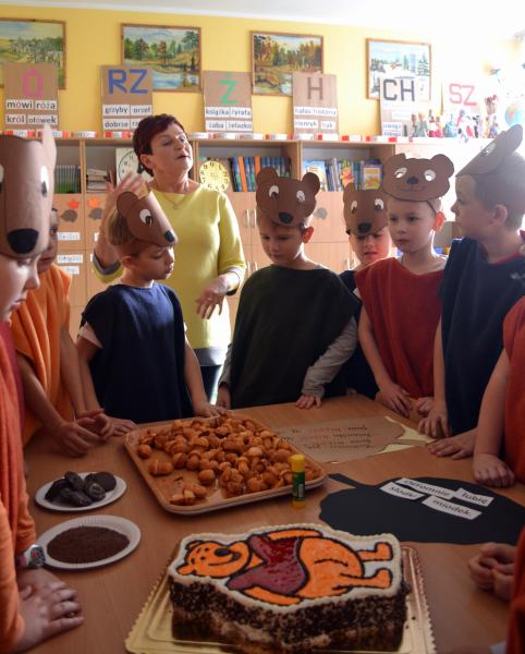 Rodzice mogli zobaczyć pracę dzieci oraz poznać metodę kolorowej ortografii, którą pracują ich pociechy. Było wesoło i kolorowo. Zajęcia zakończyły się przyjęciem na cześć Kubusia. Był tort w kształcie misia i grzybki z miodem.