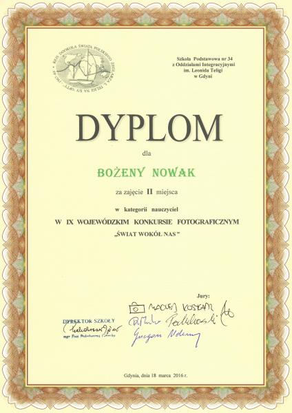 IX Wojewódzki Konkurs Fotograficzny pt. „Świat wokół nas” w tym roku został objęty honorowym patronatem Wojewody Pomorskiego Pana Michała Owczarka, Pomorskiego Kuratora Oświaty Pani Elżbiety Wasilenko oraz Prezydenta Miasta Gdyni Pana Wojciecha Szczurka. Konkurs przeznaczony był dla uczniów i nauczycieli szkół podstawowych, gimnazjów, szkół ponadgimnazjalnych. Nasz nauczyciel Pani Bożena Nowak spróbowała swoich sił w kategorii nauczyciel i zajęła II miejsce.