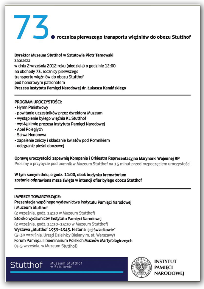 Serdecznie zapraszamy na uroczystość, która odbędzie się 2 września 2012 roku na terenie Muzeum Stutthof w Sztutowie.