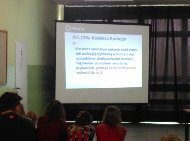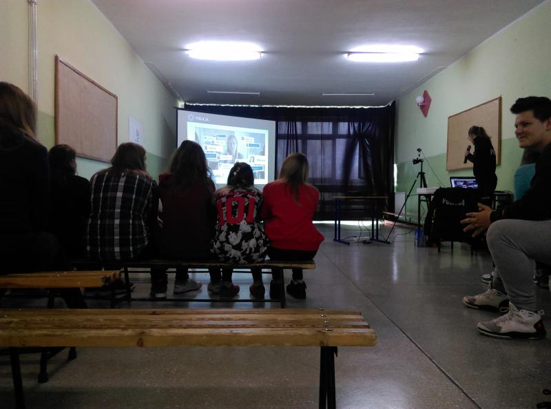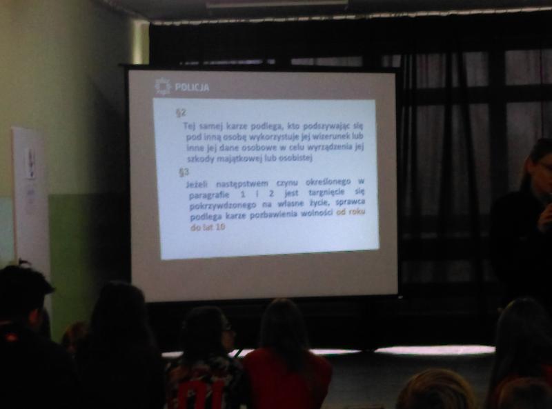 Podczas zajęć (25.04.2017) zapoznaliśmy się z objawami cyberprzemocy i dowiedzieliśmy się jaka może być odpowiedzialność karna za niewłaściwe zachowanie w sieci. Zadawaliśmy pytania a pani policjantka wyczerpująco na nie odpowiadała.