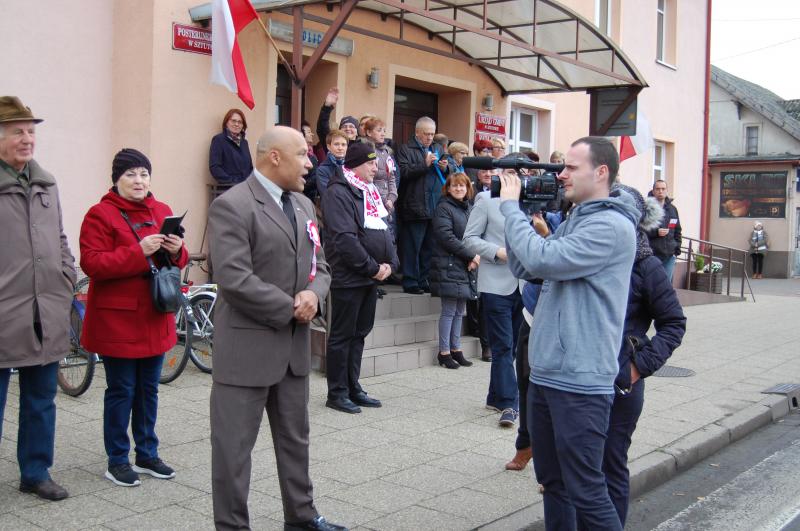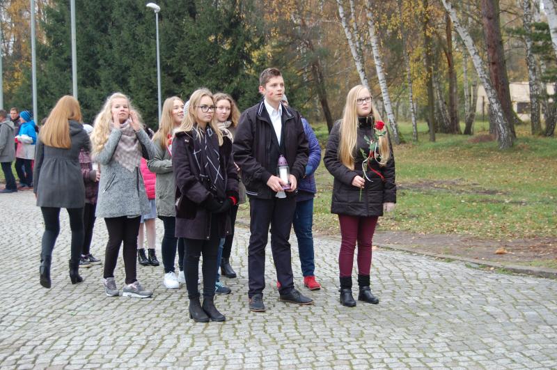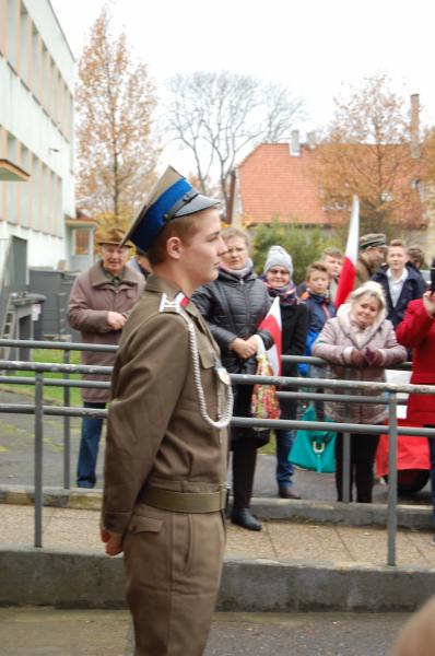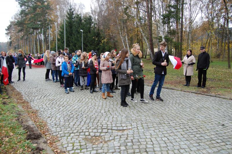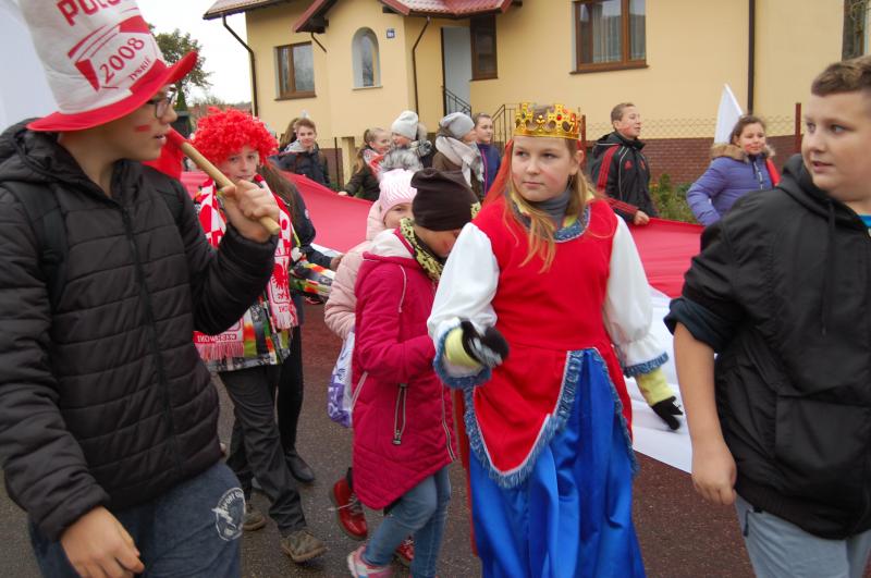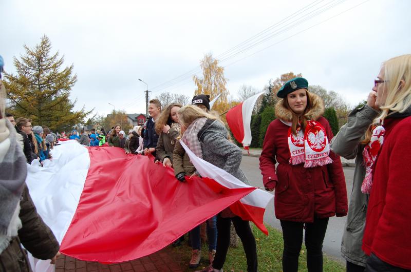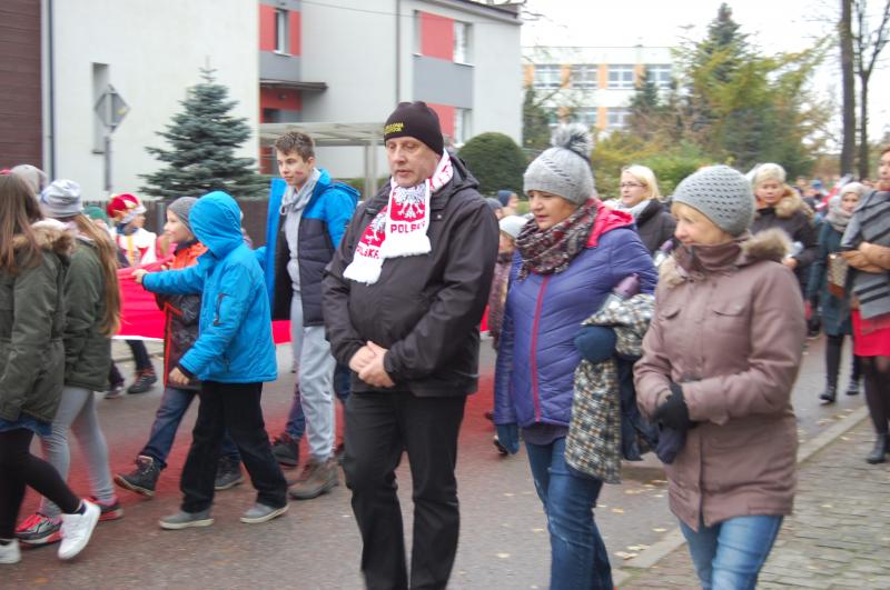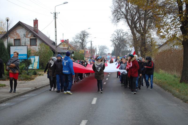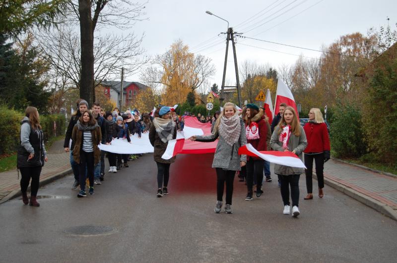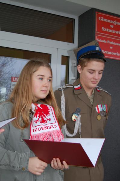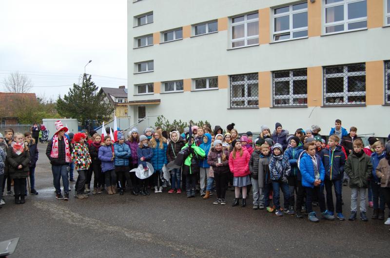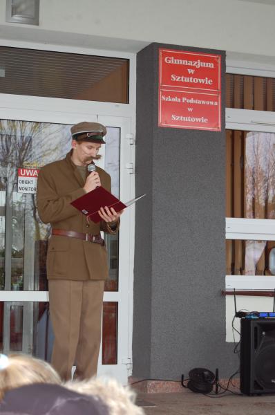 Po odśpiewaniu hymnu narodowego, uczniowie naszej szkoły, zaproszeni goście, nauczyciele, mieszkańcy gminy wyruszyli ulicami Sztutowa (Szkolna, Polna, Turystyczna, Gdańska, Krótka, Szkolna) najpierw w kierunku Urzędu Gminy w Sztutowie a następnie do Muzeum Stutthof. Uczestnicy marszu nieśli 50 metrową flagę Polski. Przed Urzędem Gminy do zgromadzonych mieszkańców przemówił wójt gminy pan Jakub Ferinade. W Muzeum Stutthof reprezentanci poszczególnych klas złożyli pod pomnikiem Walki i Męczeństwa kwiaty i zapalili znicze.