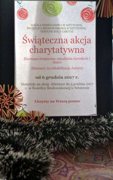 Świąteczna akcja charytatywna pod hasłem: Zbieramy na rehabilitację dla Justyny, zorganizowana przez Szkołę Podstawową, Świetlicę Środowiskową i Szkolne Koło Caritas w Sztutowie.