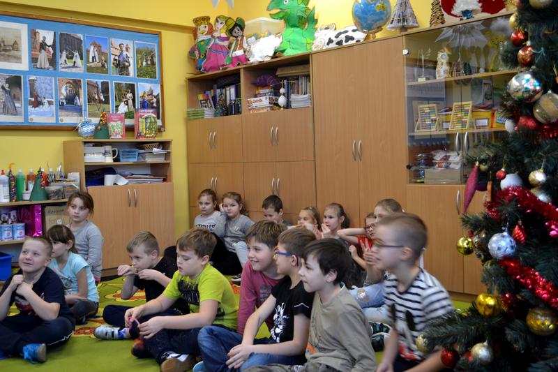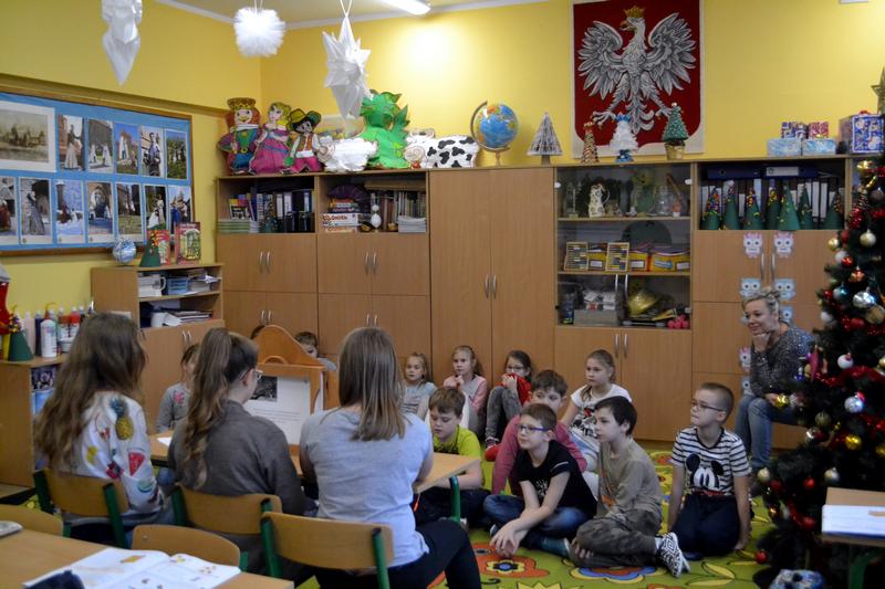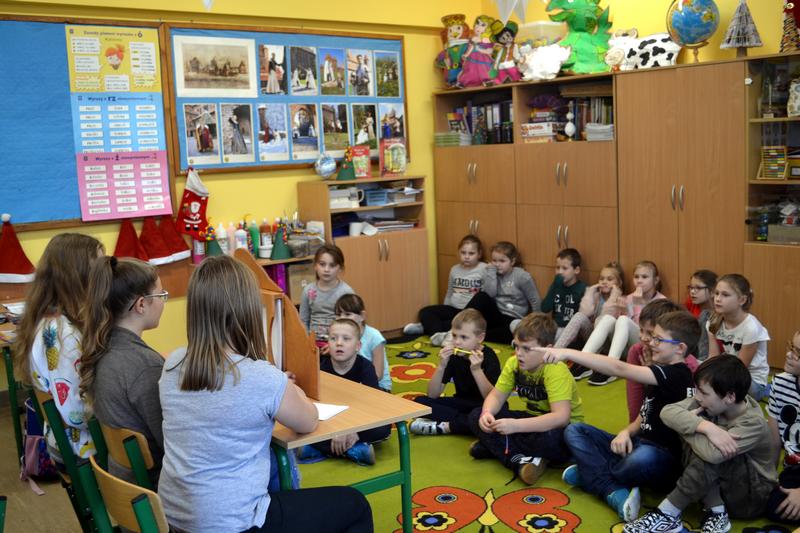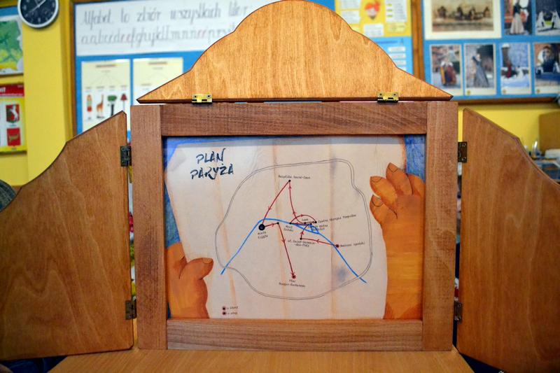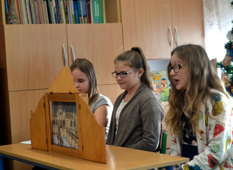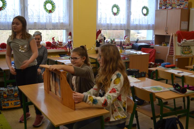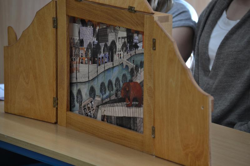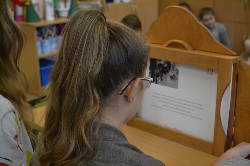 Uczennice z Vb zaprezentowały dzieciom teatrzyk „Lew w Paryżu” za pomocą japońskiej metody zwanej Kamishibai (Kami – papier, Shibai – sztuka).