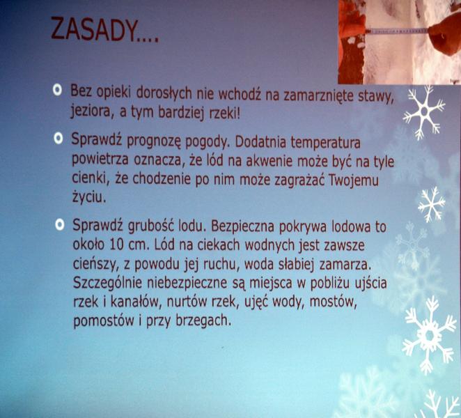 Dzięki warsztatom i zajęciom praktycznym uczniowie poznali zagrożenia związane z poruszaniem się po lodzie oraz zasady udzielania pierwszej pomocy osobie, pod którą załamał się lód.