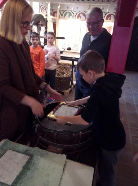 Na warsztatach dzieci próbowały swoich sił w kaligrafii, drukowały na starej żeliwnej prasie oraz stworzyły papier czerpiąc go z kadzi papierniczej za pomocą sita.