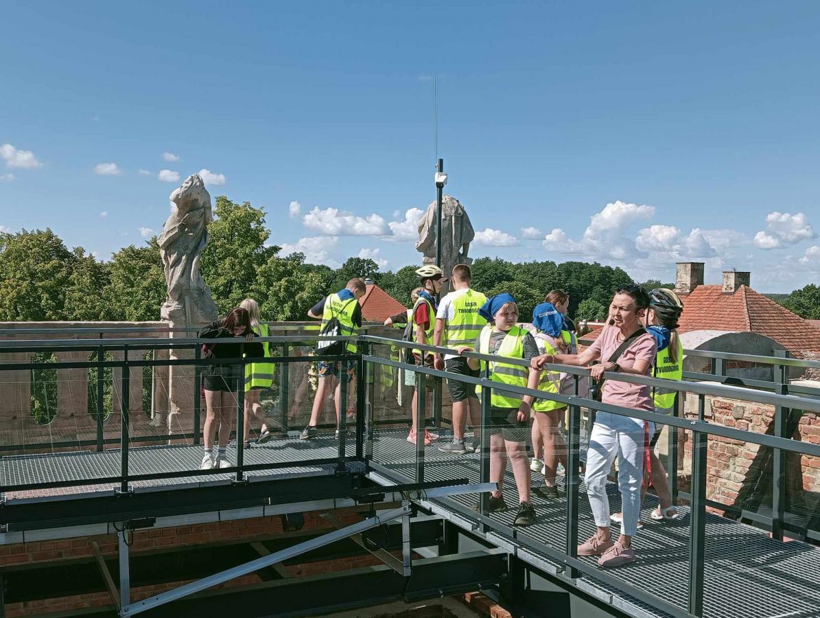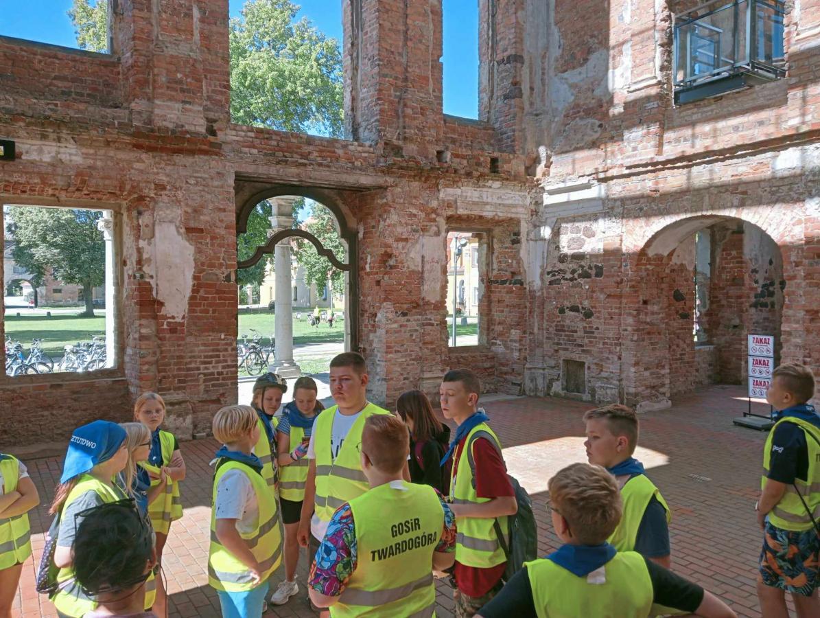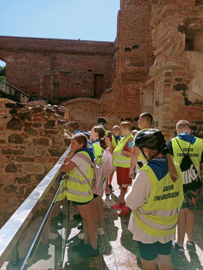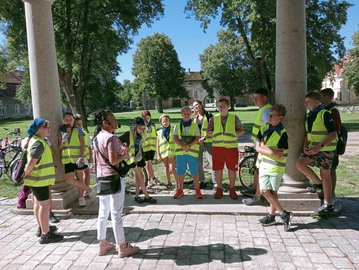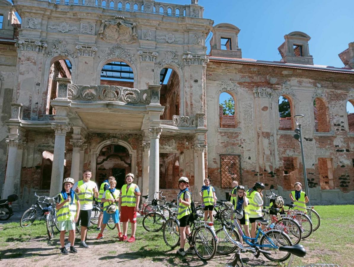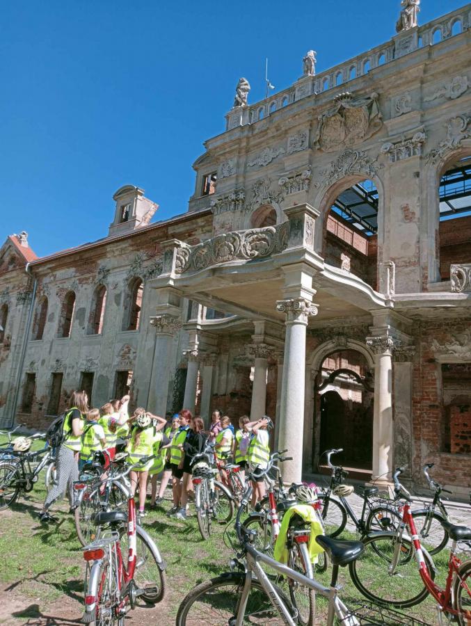Dzieci nocujące w Twardogórze korzystały dziś z wycieczek rowerowych do Miejscowości Goszcz, w której znajduje się pałac rodu von Reichenbach- Goschütz. To niezwykły zabytek wzorowany na najsłynniejszych francuskich rezydencjach, m.in. w Wersalu, wzniesiony w 1749r. i zrewitalizowany w 2021r. w formie trwałej ruiny po pożarze z 1947 roku.